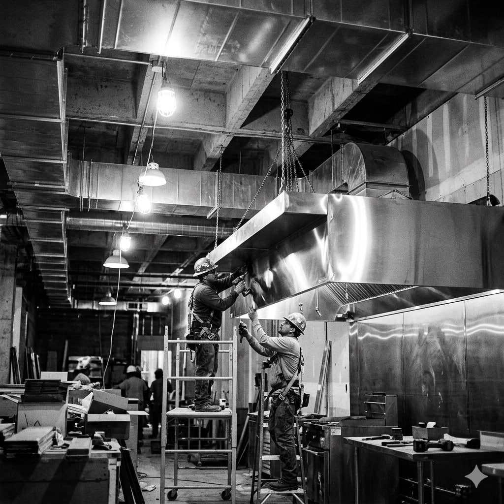 Complete commercial kitchen ventilation: hood installation, exhaust fans, makeup air units, and grease duct systems for restaurants and food service.